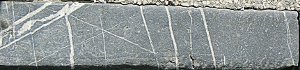 On peut voir sur les bordures de trottoirs en calcaire de Laffrey les générations de fractures dans différentes directions qui se recoupent avec, parfois, un petit décalage.